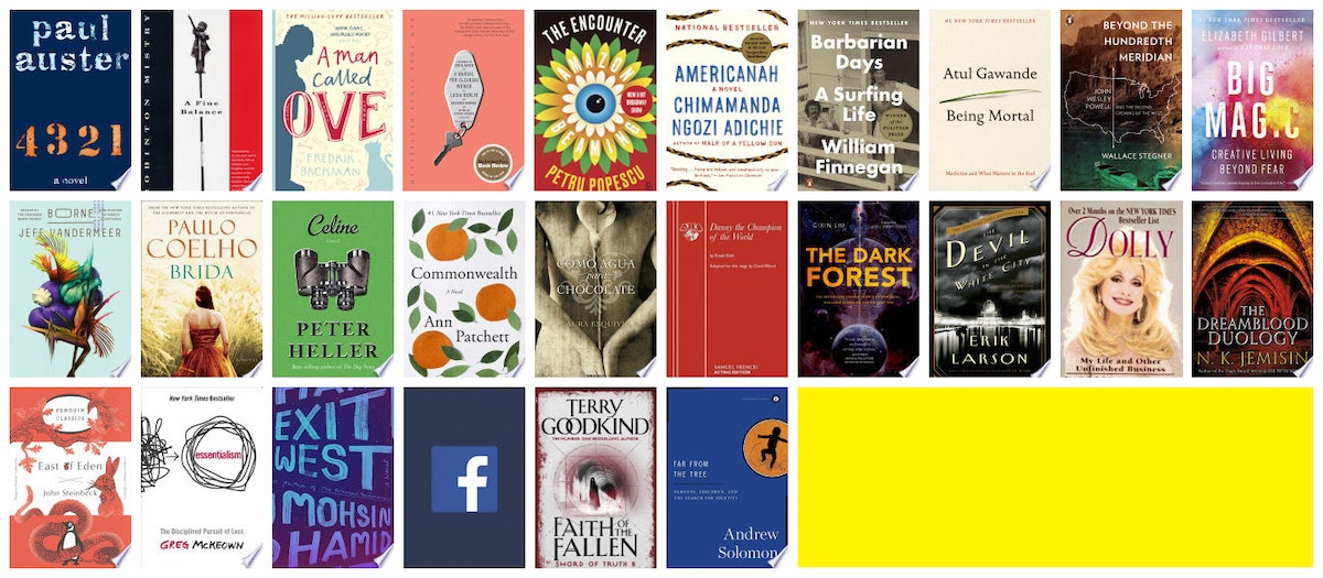 4321 ◆ A Fine Balance ◆ A Man Named Ove ◆ A Manual for Cleaning Women ◆ Amazon Beaming ◆ Americanah ◆ Barbarian Days ◆ Being Mortal ◆ Beyond the 100th Meridian ◆ Big Magic ◆ Borne ◆ Brida ◆ Celine ◆ Commonwealth ◆ Como Agua Para Chocolate ◆ Danny the Champion of the World ◆ Dark Forest ◆ Devil in the White City ◆ Dolly - My Life and Other Unfinished Projects ◆ Dreamblood Duology ◆ East of Eden ◆ Essentialism ◆ Exit West ◆ Facebook ◆ Faith of the Fallen ◆ Far from the Tree