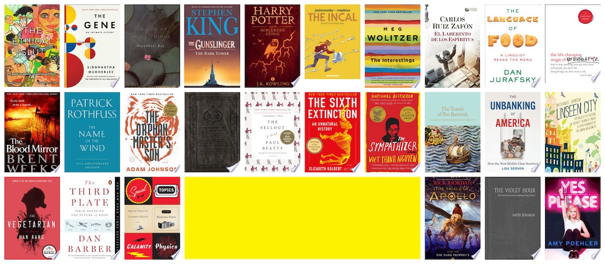 The Ethical Slut ◆ The Gene ◆ The God of Small Things ◆ The Gunslinger ◆ The Harry Potter Series ◆ The Incal ◆ The Interestings ◆ The Labyrinth of Spirits ◆ The Language of Food ◆ The Life-Changing Magic of Not Giving a F*ck ◆ The Lightbringer Series ◆ The Name of the Wind ◆ The Orphan Master’s Son ◆ The Quran ◆ The Sellout ◆ The Sixth Extinction ◆ The Sympathizer ◆ The Travels of Ibn Battutah ◆ The Unbanking of America ◆ The Unseen City ◆ The Vegetarian ◆ The Violet Hour ◆ Third Plate ◆ Topics in Calamity Physics ◆ Trials of Apollo II ◆ Yes, Please