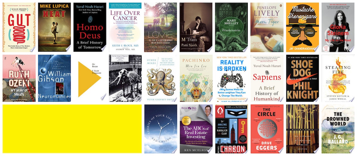 Gut ◆ Heat ◆ Homo Deus ◆ Life Over Cancer ◆ Lovie ◆ M Train ◆ Mary Shelley’s Frankenstein ◆ Moon Tiger ◆ Mustache Shenanigans ◆ My Life on the Road ◆ My Year of Meats ◆ Neuromancer ◆ On Booze ◆ Origin of the Species ◆ Other Minds ◆ Pachinko ◆ Reality is Broken ◆ Sapiens ◆ Shoe Dog ◆ Stealing Fire ◆ Stories of Life and Others ◆ The ABCs of Real Estate Investing ◆ The Amazing Adventures of Kavalier and Clay ◆ The Circle ◆ The Collapse of American Criminal Justice ◆ The Drowned World