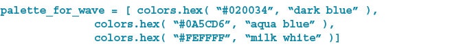 I leverage the power of my computer to generate the artwork. Where a classical fine artist would pull out their oils and brushes to express colors and shapes, I do the same with parameters. For example, I defined a palette of colors for painting waves like this:
