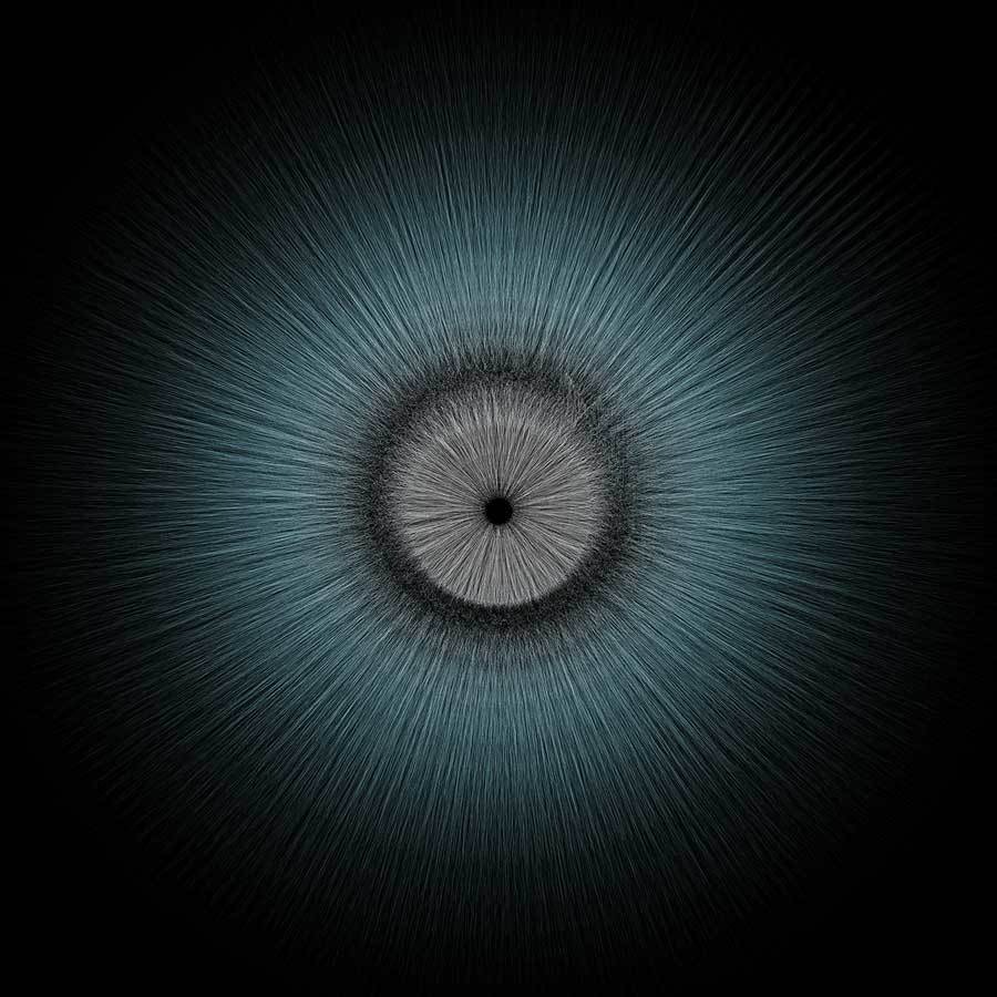My goal was to use the complex texture to create the visual effect of catching or entrapping the audience in the “eye.” The computer is an exciting tool for creating art like this, which requires repetitive, intricate work. A piece of generative artwork composed of millions of shapes can be drawn in just a few minutes. Rendered by hand, the same piece might take a human ten years to accomplish.