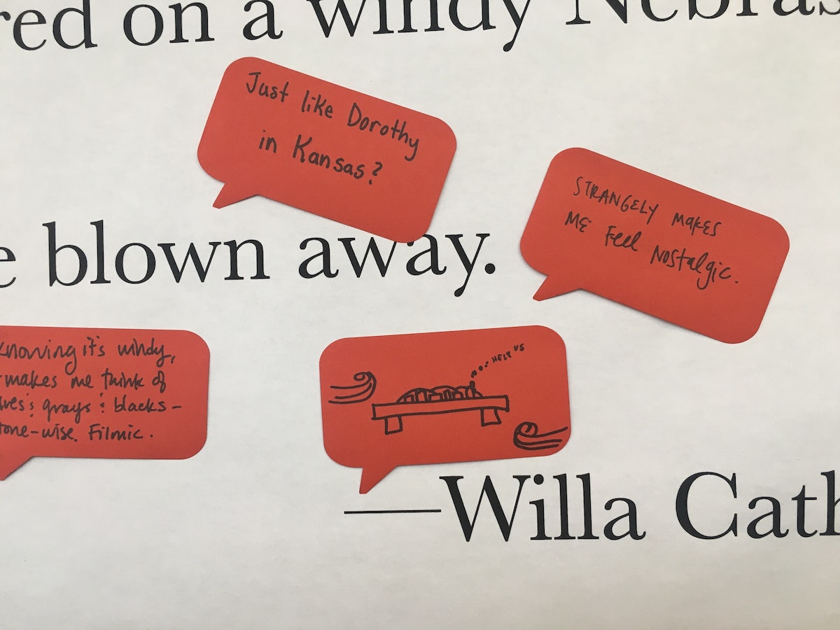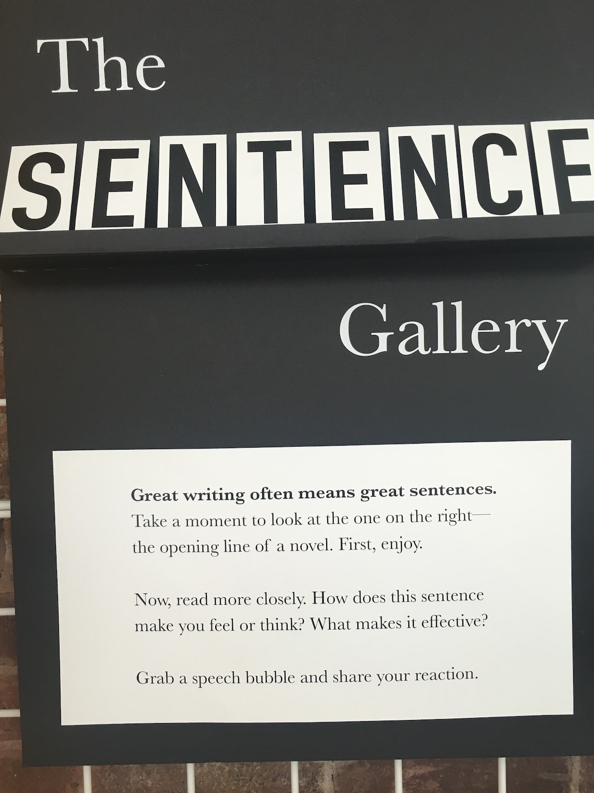 To bring The Sentence Gallery to life, communications designers Jason Baker and Sera Koo built a wall out of foamcore and mounted it in our main community space. Over a few weeks, they showcased a series of sentences, writ large. They also laser-cut thought bubbles from Post-it pads and invited people to reflect on what made each sentence effective. The sharp point of the bubble operated as a marker that allowed passers-by to draw attention to whatever effect they’d noticed, placing their comment at a specific moment in the sentence.
