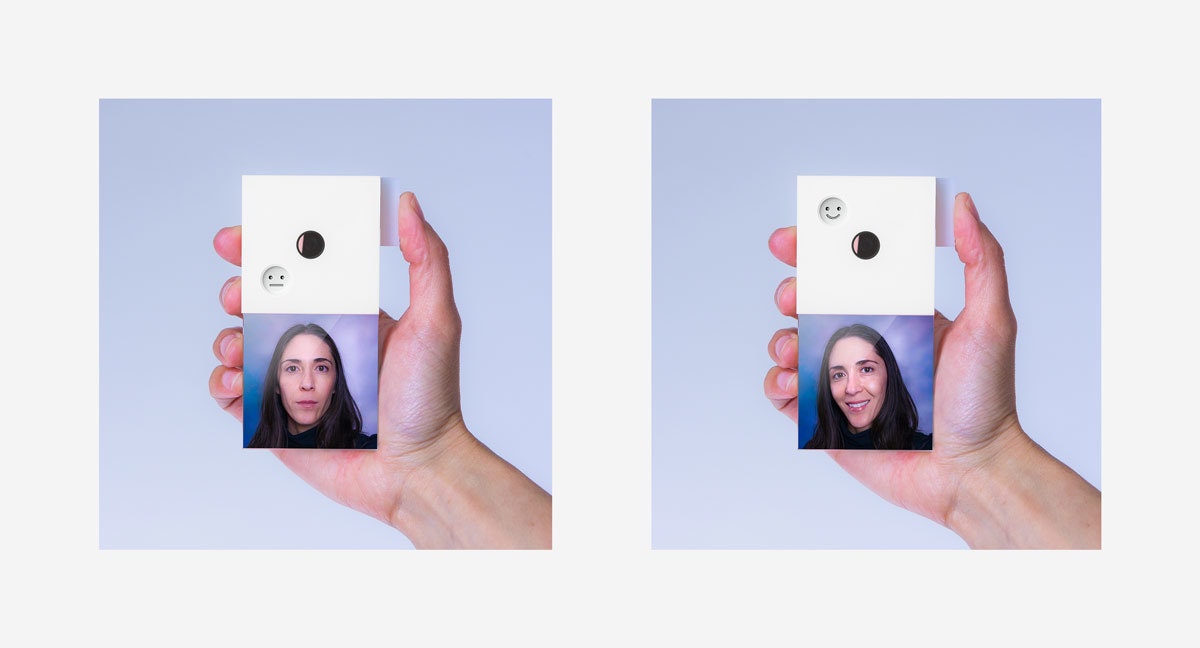To help Brainchild differentiate between the two picture sets you simply twist the front plate, switching between two learning modes. The serious smiley means every picture you take will teach Brainchild how you look “normally”. Switching to the happy smiley means every picture you take will teach it what it looks like when you look your best. This is how you get to know each other.