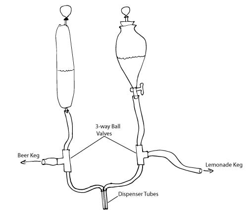 Thirsty partygoers begin by turning the large hand crank on the front to select their preferred beer-to-lemonade ratio (from 0–100%). When the analog meter on top points to the desired proportions, they flip a missile switch to open the valves. The two glass vessels on either side of the machine fill with beer and lemonade, respectively, then send the home-brewed concoctions into their waiting pint via a dispensing tube.
