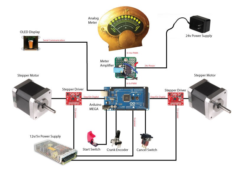 An Arduino Mega controls the shandy machine. This diagram shows how all of the components are connected: