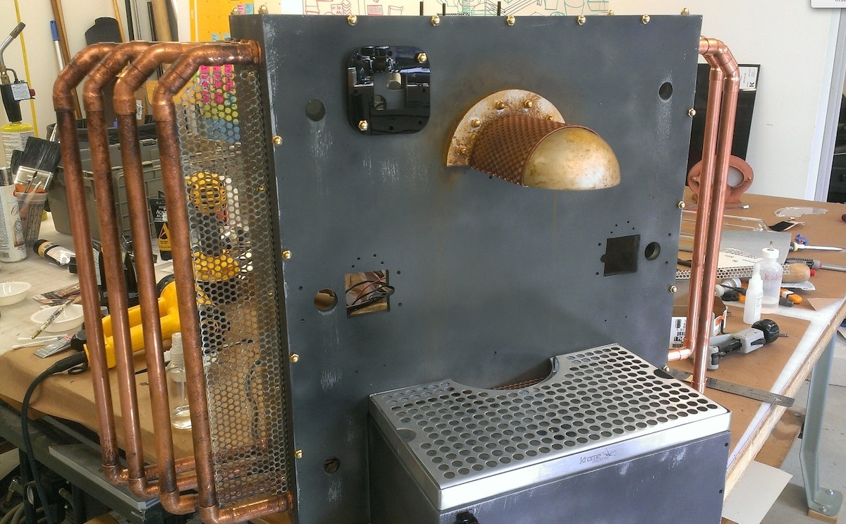 We started by stripping everything off the main body of the machine and painting it all silver. After that dried, we sprayed it again with black paint. While that was drying, we took Scotchbrite pads and scratched the corners, edges, and anywhere else we thought needed a little character. After the black paint layer dried completely, we started to reattach all the other pieces. We painted them copper or brass and scratched them up here and there to add wear and tear.