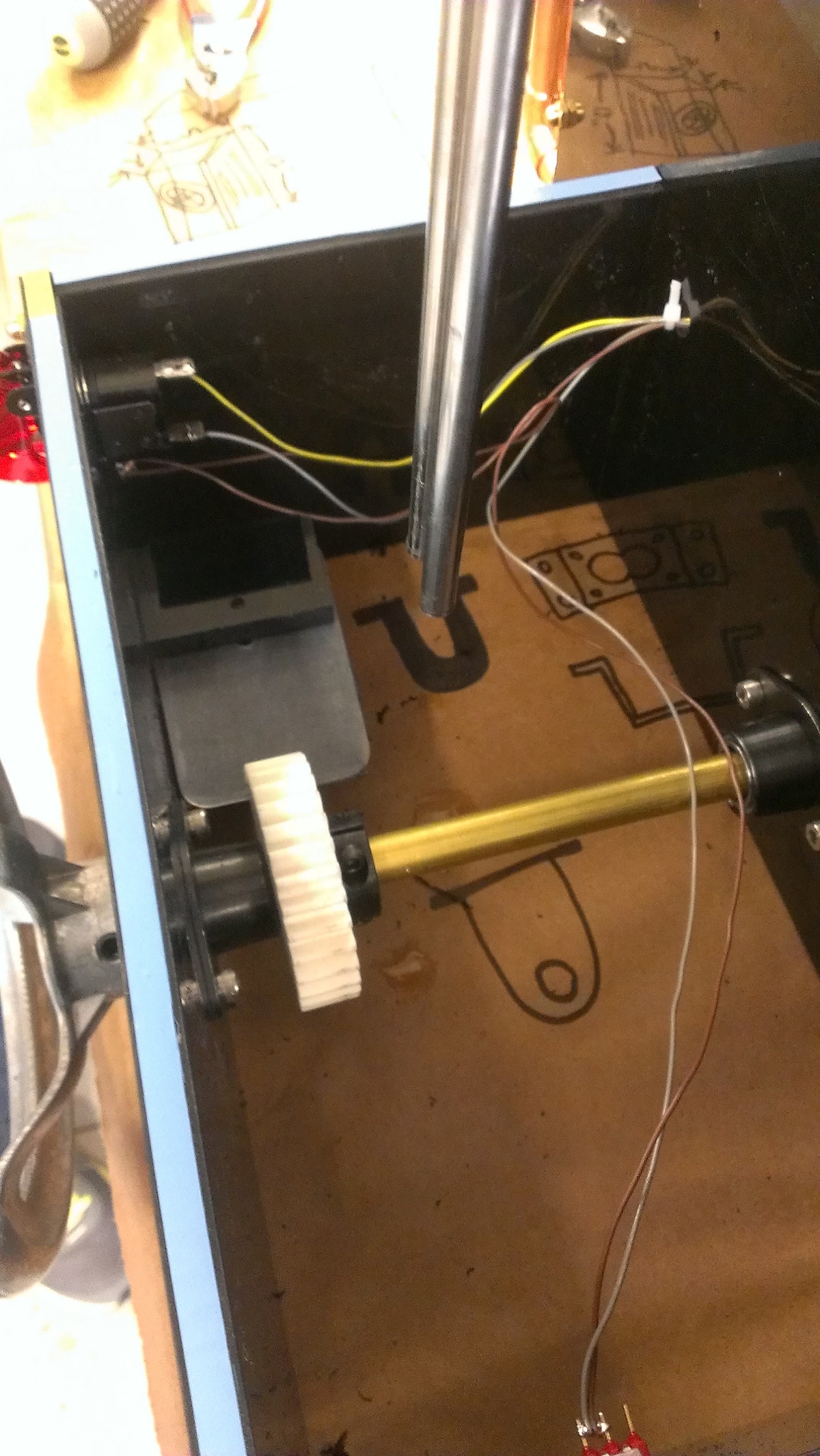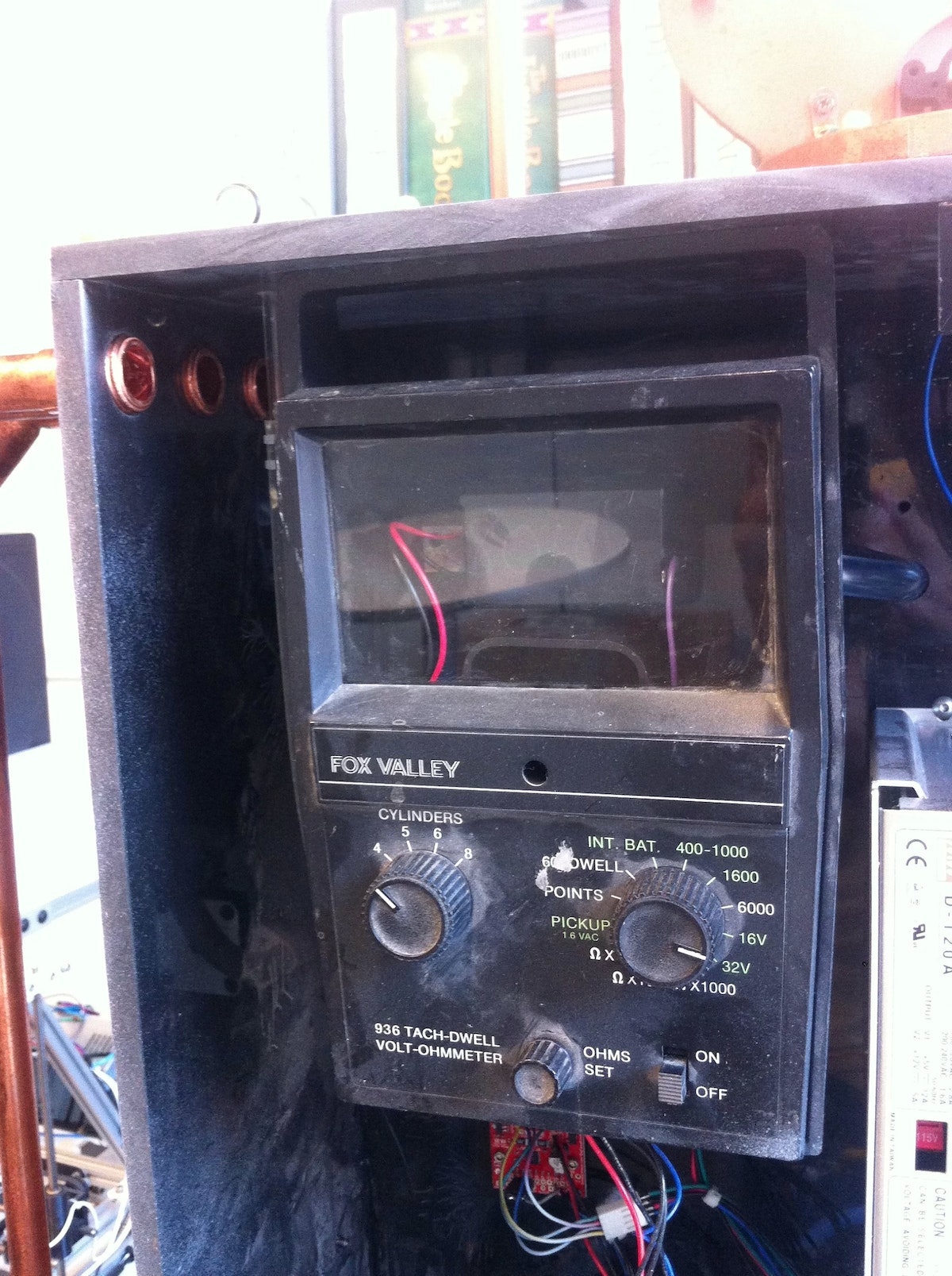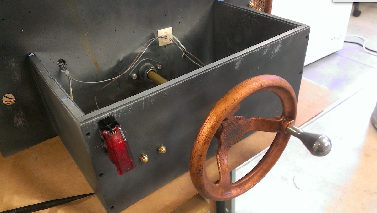 The main source of feedback on the machine is the large analog meter on the top of the machine. We searched online in vain for a large meter that would fit our steampunk style, have an appropriate measuring range, and could be controlled by Arduino. In the end, we found an old automotive meter that measured voltage from 0-16v.