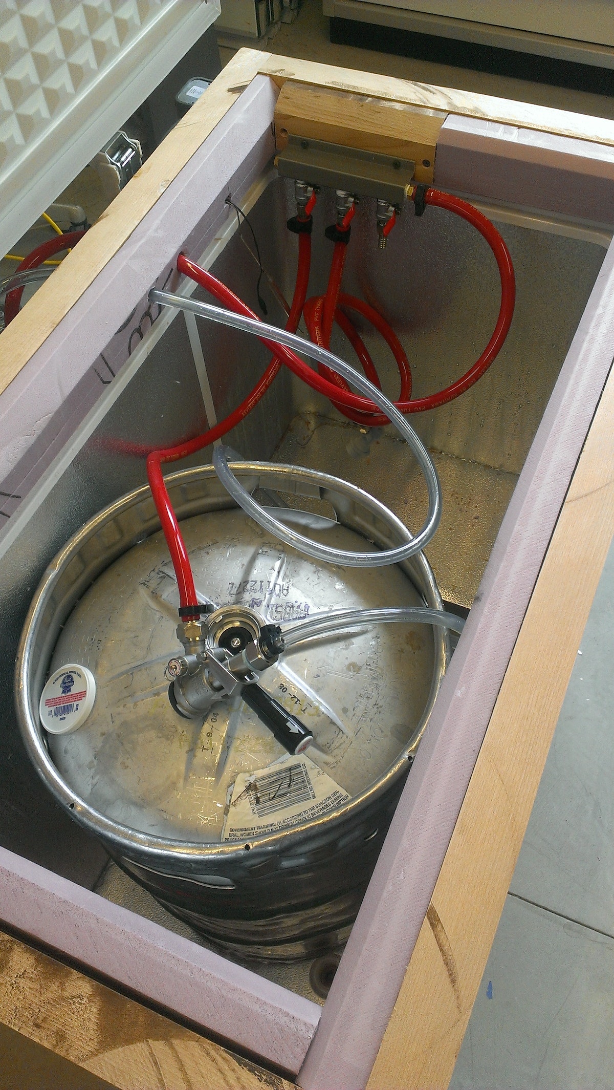 The machine sits on top of a standard, top-loading freezer replumbed to hold two kegs (one containing wit, the other sparkling organic lemonade).