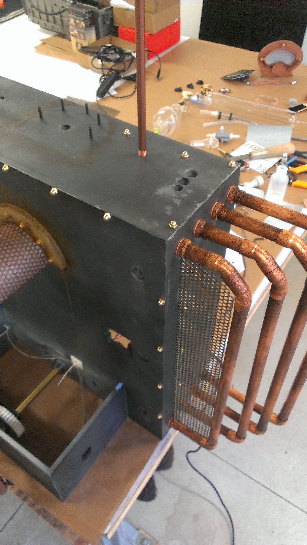 We’re big fans of steampunk, so from the beginning, we knew we wanted the Mix Master 2000 to look quasi-Victorian. First, we used as much copper and brass as possible, then, drawing on John’s background as a Hollywood set designer, we “antiqued” it using various scenic techniques.