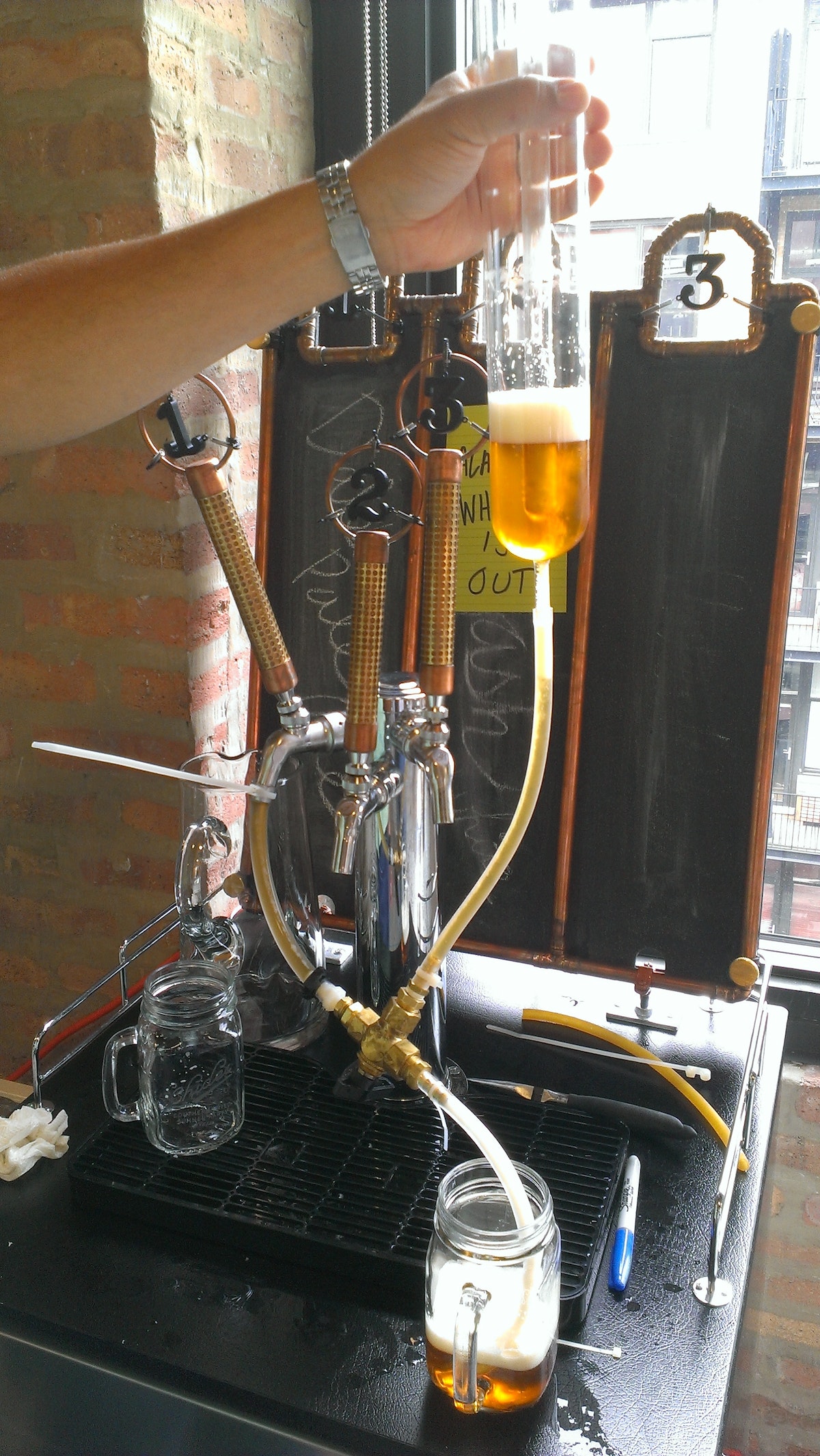 They looked straight out of a science lab, which was cool, but we thought we’d have some foaming issues because of their small openings. We hooked up a hose from the tap in our kegerator and tried filling them with beer. Sure enough, the beer started foaming immediately and it took several minutes to drain using gravity. Not good if you want a proper pour...