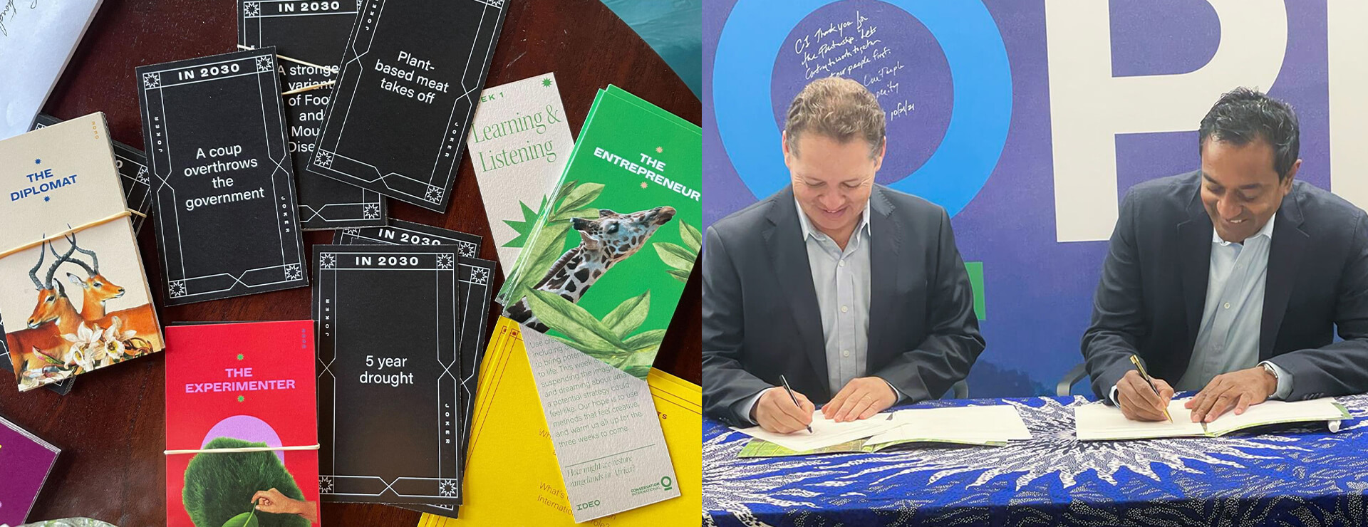 For example, to unlock a new scale of impact, the global environmental non-profit Conservation International (CI) needed a strategy that could unite its country offices on the African continent. Each had its own priorities, norms, goals, and personalities—a huge source of strength for the organization, but a barrier to scale. To create space for a new approach, CI jumped decades years into the future. Partnering with IDEO, CI experts and teams developed a set of short stories set in the year 2050, exploring future possibilities in sequestration research, satellite monitoring technologies, and more.