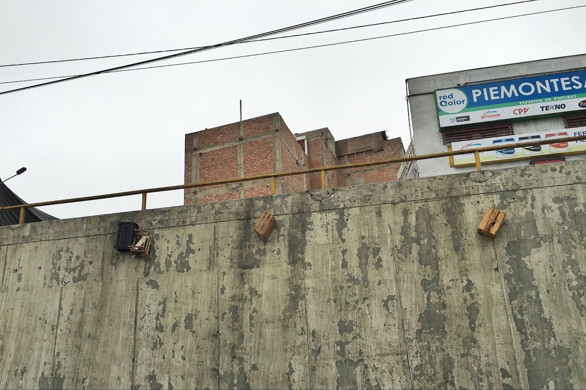 In Lima, Peru, people who give out free newspapers or sell water and snacks on the on-ramps to the highway use these little wooden crates to sit on or put products on. To avoid carrying the crates home every night, they tie a rope between the box and the railing, then drop it over the edge overnight. This keeps them from getting cleared or taken because they're virtually invisible from the other side. The crates aren't that valuable, but it's probably a hassle for vendors to carry them around or find new ones every day.