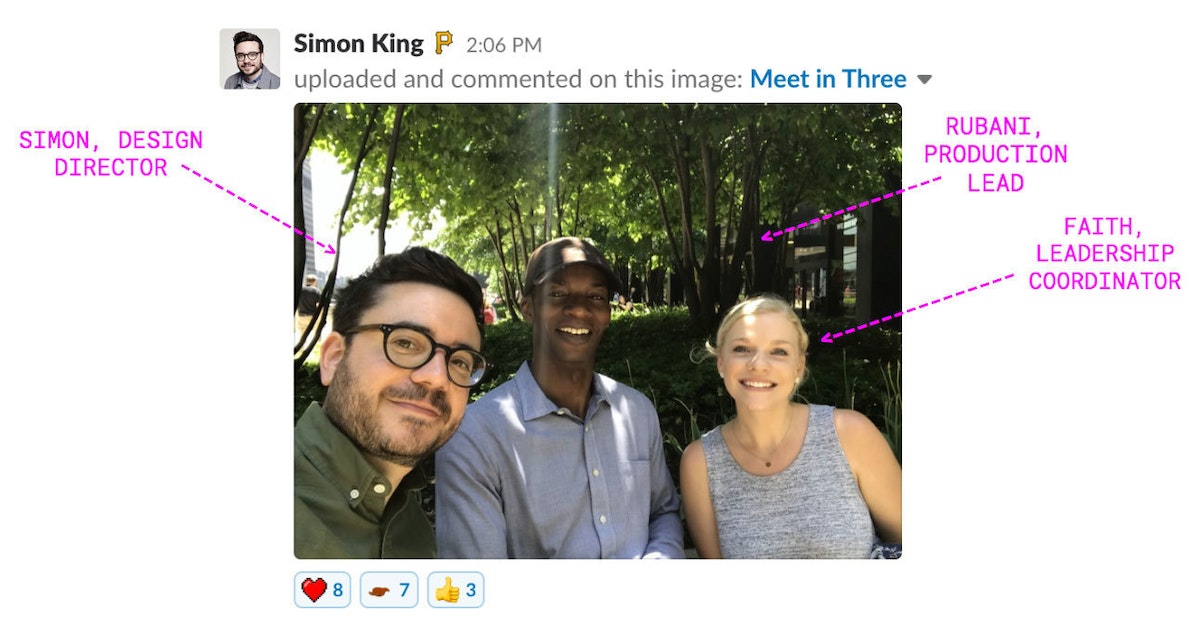 Since Meaty’s initial rollout in late March, there have been 112 group lunches in Chicago (according to Google calendar), bringing together everyone from support staff to directors to designers. Word spread to other studios, and the Palo Alto and San Francisco offices are on deck to start their own group lunches. Meaty has also virtually connected IDEOers around the world, scheduling calls between design researchers in Cambridge and New York, and handling the time-zone-juggling challenge of scheduling global calls between Munich, Shanghai, and Tokyo.