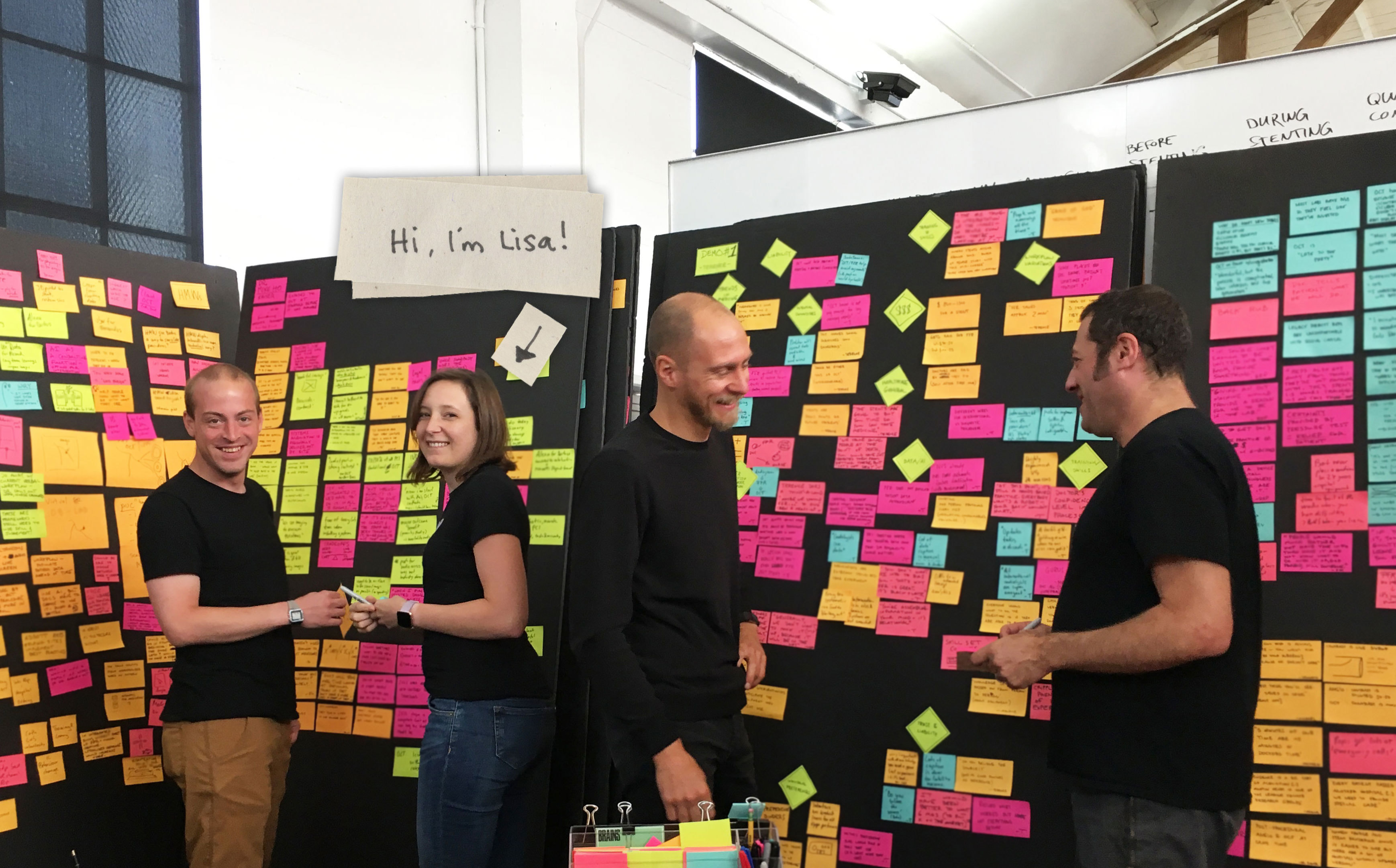 The team comes together to download and synthesize what we learned through our research observations. We transcribe things we saw and heard on Post-it notes, and cluster them so we can spot patterns. We’re seeing themes about the consequences of delays in decision-making during the procedure, and the effects of training on team efficiency. As we start to develop concepts based on the pain points we’ve discovered, I suggest that something like a personalized training program could increase team efficiency by helping people skill up faster.