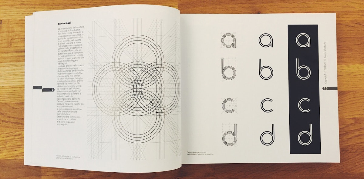 I created my first font, Cerchio Futuro, at university. It was a really rounded/modular font based on one unit (that’s the constraint they gave us). I hated it, but I got the highest mark in the class and was featured in a book Metodologia Progettuale Del Graphic Design (below).