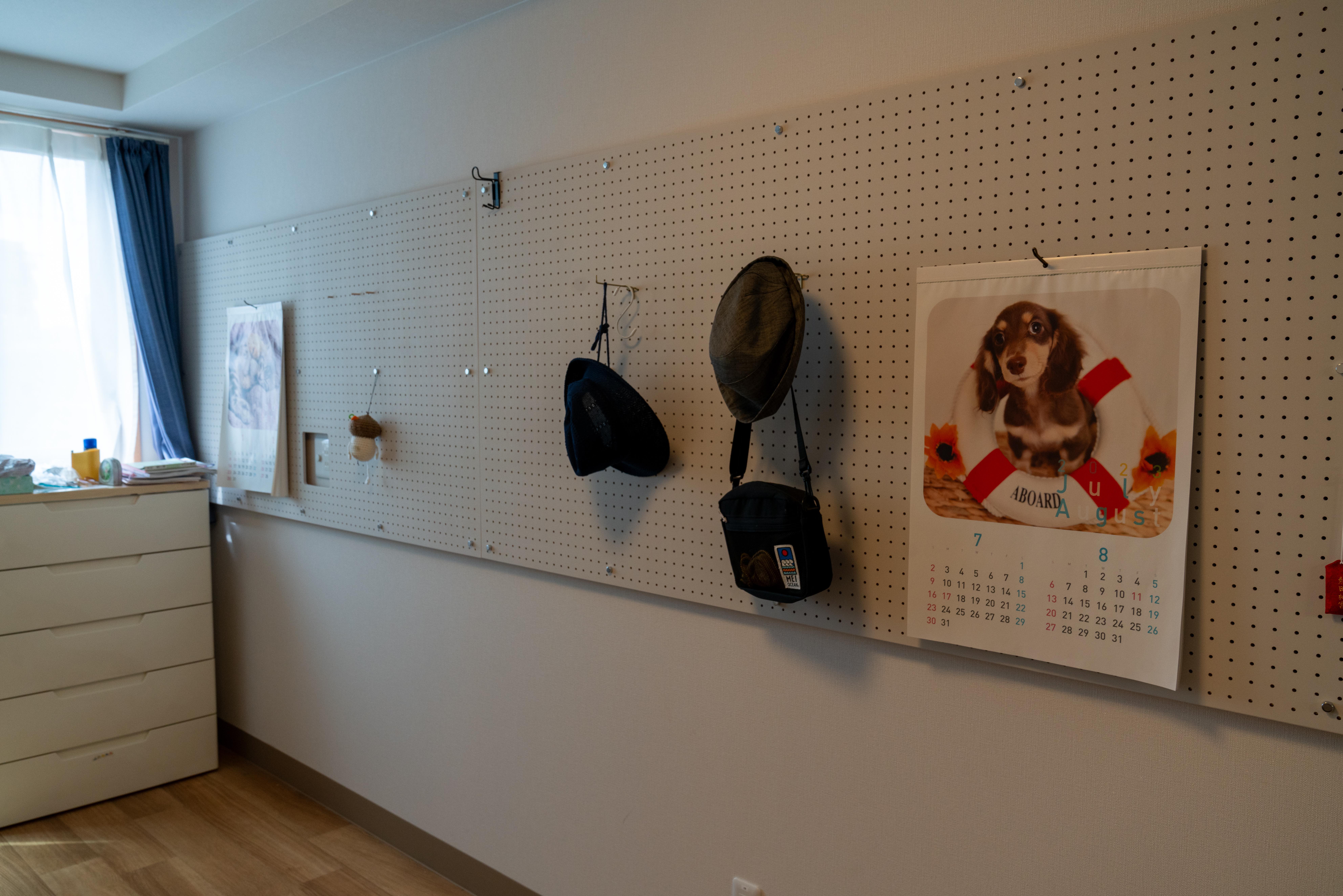 日本の多くの介護施設では、運営のしやすさや介護のしやすさを優先し、個室のレイアウトや什器は定型化されることが一般的です。しかし、入居者の性格や健康状態はさまざま。たとえば認知症の入居者は、介護施設のような馴染みのない新たな環境で大きな不安を抱えることがあります。そのため、家族は入居者の私物を自宅から持ち込むことで、入居者が元の生活を思い出し、少しでも安心感を覚えられるような工夫をしていました。一方、介護導線を担保するために持ち込めるものや配置の仕方は限られています。そこでチームは、「なんでもウォール」を考案。自由にカスタマイズできる壁を部屋に設けることで、介護スタッフの導線を確保しながら、家族が無理なく私物を持ち込むことができ、入居者が安らぎを感じられるような住環境をつくることを提案しました。